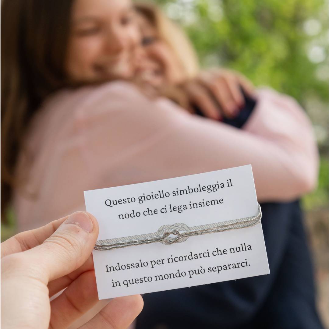 Immagina la gioia nei loro occhi mentre scoprono il tuo regalo. Un momento che rimarrà impresso nella memoria di entrambi. PENDI ha creato il Bracciale con Nodo per rappresentare legami indissolubili, che si tratti di amore, amicizia o di un'affettuosa connessione. Ogni nodo è una promessa di vicinanza, un simbolo di un legame che resiste al tempo. Questo bracciale non è solo un gioiello, è un ricordo tangibile di un affetto che dura per sempre.